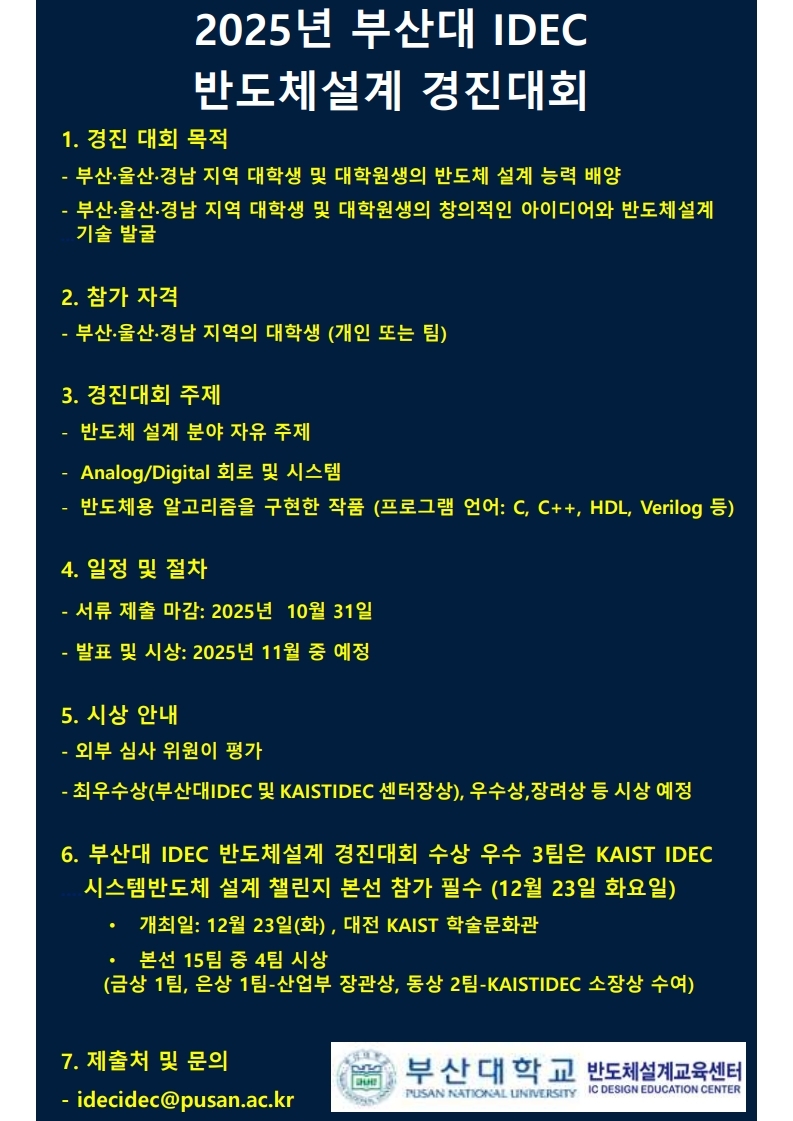 fnctId=bbs,fnctNo=2650 작성일 2025.10.10 수정일 2025.10.10 작성자 신효재 조회수 243 [반도체IDEC] 반도체설계 경진대회 참가자 모집(~10/31) 첨부파일 sample_참가신청 및 설계설명.docx 미리보기