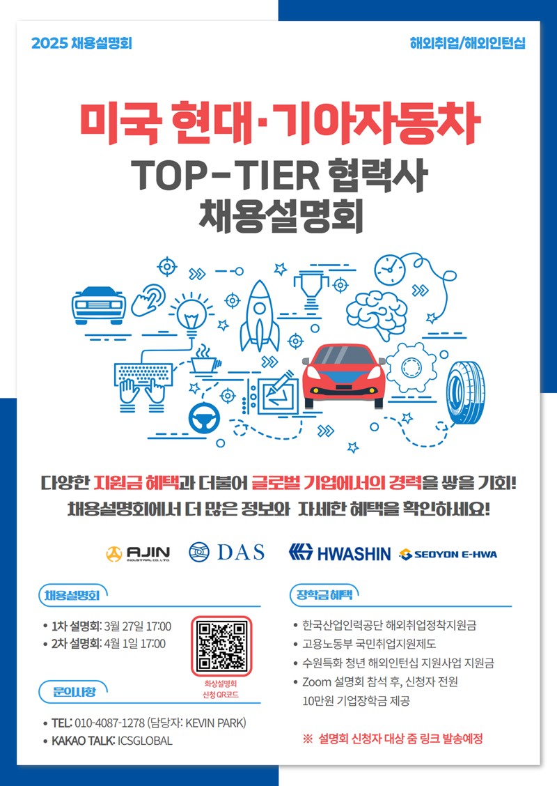 fnctId=bbs,fnctNo=2654 작성일 2025.03.20 수정일 2025.03.20 작성자 안수연 조회수 399 미국 현대-기아자동차 TOP-TIER 협력사 채용설명회 첨부파일 첨부파일이(가) 없습니다.