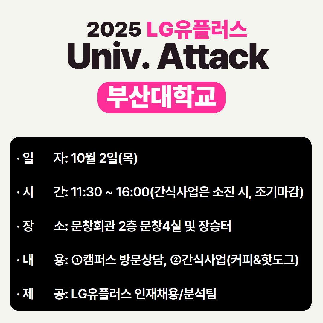 LG유플러스 2025 하반기 채용상담회 일정을 아래와 같이 알려드리니, 많은 학생들이 참여할 수 있도록 안내하여 주시기 바랍니다.