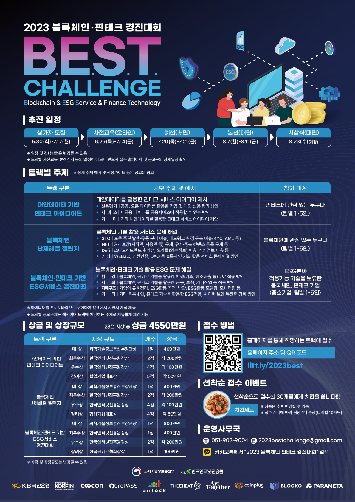 fnctId=bbs,fnctNo=2655 작성일 2023.06.21 수정일 2023.06.21 작성자 안수연 조회수 2191 [KISA] 2023 블록체인·핀테크 경진대회 BEST Challenge 첨부파일 (공고문) (KISA) 블록체인, 핀테크 경진대회 BEST 챌린지 참가자 모집 공고문_0530.hwp 미리보기